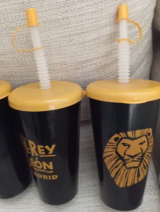 Set de vasos con cañita del musical El Rey León. - Diseño negro con tapa y detalles en color dorado. - Ilustración del león en cada uno de los vasos y texto El Rey León Madrid