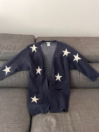 Cárdigan de punto azul marino con estampado de estrellas blancas de Zara. - Talla 10 años. - Diseño abierto. - Dos bolsillos delanteros.