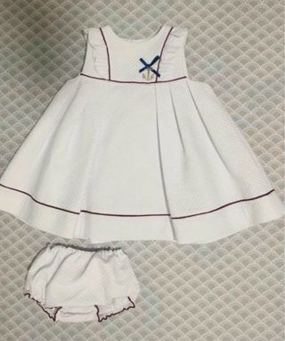 Precioso conjunto de Noma Fernández. - Vestido blanco de piqué con textura acolchada y detalles de puntilla Navy. Talla 5 - Chaqueta bolero de punto Jesua del Pozo talla 4 - Lazos decorativos en el cuello.