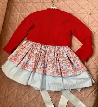Precioso vestido Babiné talla 6 y rebeca para niña Tizzas talla 5. - Vestido con estampado floral . - Rebeca de punto rojo con detalles calados. - Lazos de satén azul claro. - Talla 6 años.