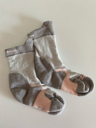 Calcetines térmicos para la nieve, ideales para mantener los pies calientes. - Diseño con zonas reforzadas. - Talla 27-30. - Combinación de colores gris, blanco y rosa. Solo tienen un uso.