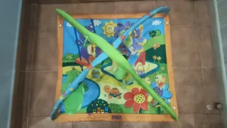 Manta de actividades para bebés de la marca Tiny Love, con un diseño colorido y divertido. - Incluye dos arcos de juego. - Varios juguetes colgantes para estimular al bebé. - Espejo de seguridad. - Base acolchada y suave.