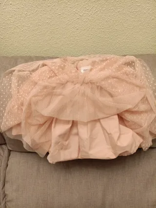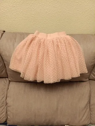Preciosa falda de tul para niña en color rosa pálido. Es muy ligera y con un diseño encantador. - Tejido de tul con pequeños topos. - Cintura elástica para mayor comodidad -Usada en una ocasión. Cómo nueva.