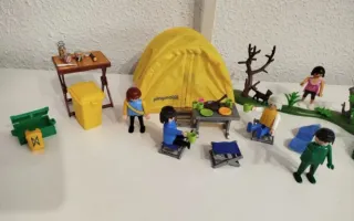 Set de Playmobil de Verano Diversión Camping. Incluye figuras y accesorios para recrear escenas de camping. - Tienda de campaña amarilla. - Mesa de picnic con sillas. - Figuras de personas y animales. - Accesorios de camping como cubiertos y sartenes. - Contenedor de basura amarillo y verde.
