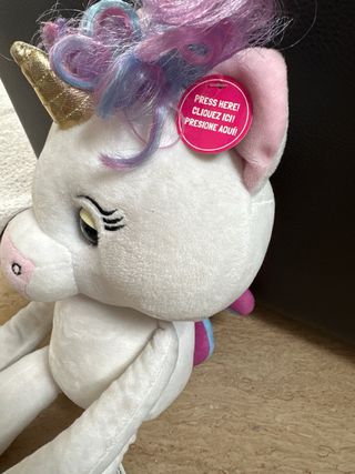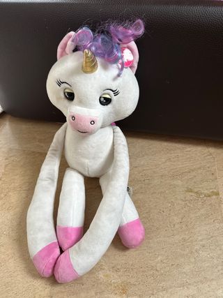 Unicornio interactivo de la marca Wow Wee, modelo Fingerlings. Este adorable unicornio blanco tiene detalles en rosa y un cuerno dorado. - Melena rizada multicolor (morado y azul). - Orejas y puntas de las patas en color rosa. - Cuerno dorado brillante.