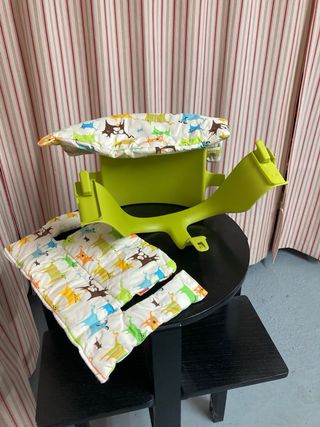 Conjunto de accesorios para trona Stokke Tripp Trapp. - Cojín de asiento con estampado de gatos. - Protector de arnés a juego.