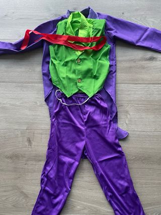 Disfraz de Joker para niño, talla 7-9 años. Incluye chaqueta, chaleco y pantalón. - Chaqueta morada con solapas. - Chaleco verde con botones y parte interior chaleco. - Pantalón morado. - Lazo rojo. La parte del interior del chaleco está manchado pero justo es la parte que no se ve porque el chaleco va encima (ver última foto)
