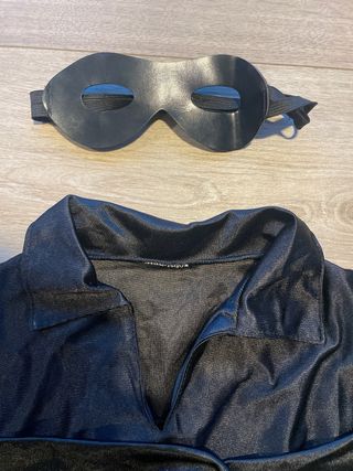 Disfraz de El Zorro para niños de 9 a 11 años. - Incluye camisa negra con detalles rojos. - Pantalón negro con raya lateral roja. - Cinturón rojo. - Antifaz - Espada - Gorro Z