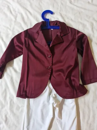 Disfraz de jinete o amazona para niños de 6 a 8 años. Hecho en modista. Chaqueta raso. - Chaqueta de color burdeos satinado. - Pantalón blanco. - Botas altas negras. - Cierre de botones en la chaqueta. Usado una manana