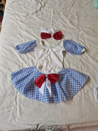 Disfraz de Dorothy del Mago de Oz, ideal para niños de 6 a 8 años. Incluye vestido y diadema. Hecho en Modista - Vestido blanco con mangas abullonadas de cuadros azules. - Falda de cuadros azules con lazo rojo y blanco. - Diadema a juego con lazo rojo. Utilizado una manana