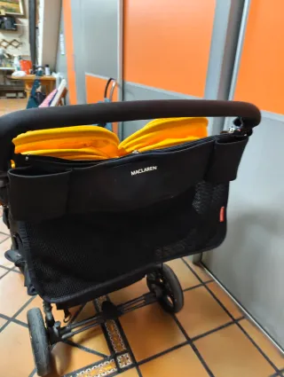Cochecito doble para bebés de la marca baby Monster, modelo Easy Twin - Diseño en color negro. - Capotas amarilla - Espacio de carga debajo del cochecito - Bolsa Maclaren de regalo Precisa limpieza