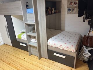 Litera moderna con diseño funcional y práctico. - Estructura de madera con acabado gris y blanco. - Incluye cajones inferiores para almacenamiento. - Escalera con peldaños seguros. - Estantes integrados para libros o decoración.