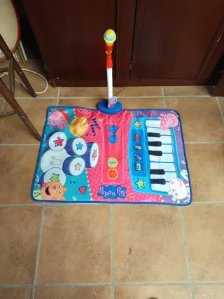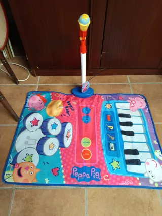 Alfombra musical interactiva de Peppa Pig con piano y batería. - Incluye micrófono. - Diseños coloridos de Peppa Pig y amigos. - Botones de demostración y parada.