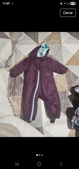 Mono de nieve para bebé de la marca Wedze. Ideal para mantener a los más pequeños abrigados y secos. - Color morado con detalles en azul claro. - Cierre frontal. - Capucha integrada.