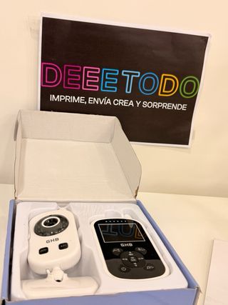 Sistema de vigilancia para bebés GHB con cámara y monitor. - Cámara blanca con lente. - Monitor con pantalla y botones de control. - Diseño compacto y portátil.