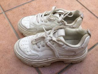 Zapatillas deportivas Zara Monster en color blanco, talla 32. - Cierre con cordones. - Diseño con detalles perforados en la puntera. - Suela gruesa y cómoda. Aunque en las fotos se ve alguna rozadura, por lo demás, están prácticamente nuevas. Fíjese en las suelas.