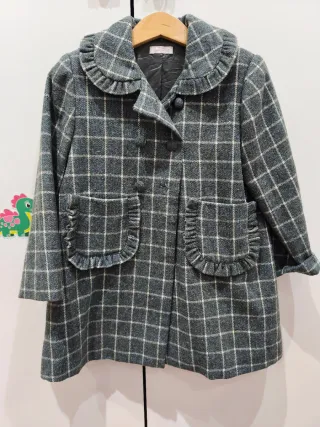 Abrigo de cuadros para niña, talla 5 años. Un diseño encantador con cuello volante. -Marca My Little C - Tejido de cuadros gris y blanco. - Cuello con volante. - Dos bolsillos delanteros con detalle de volante. - Cierre de botones.
