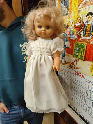 Preciosa muñeca vestida para la ocasión especial de la comunión. Ideal como recuerdo o para jugar. - Vestido blanco con detalles de encaje. - Cinta a juego en el pelo. - Collar dorado con medalla. Aprietas la tripita y habla