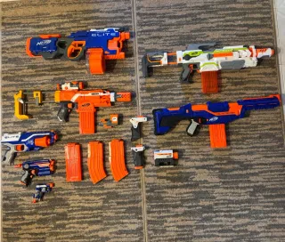 Conjunto de pistolas Nerf Elite y accesorios. - Nerf Hyperfire Elite - Nerf Modulus - Nerf Delta Trooper - Nerf Elite Disruptor - Nerf N-Strike Elite - Cargadores adicionales