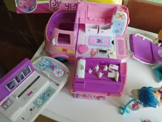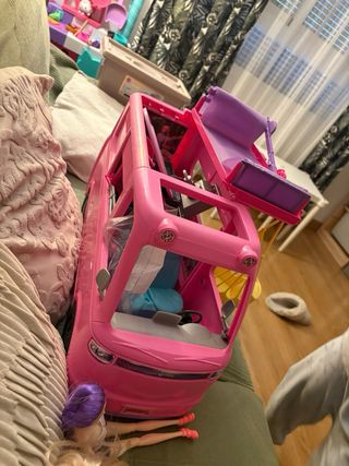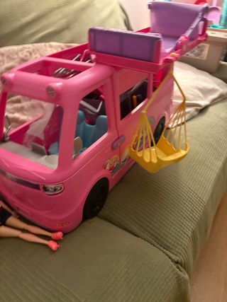 Caravana de juguete Barbie en color rosa, ideal para horas de diversión. Comprada el 10 de enero de este año . Sin uso ninguno - Incluye accesorios. - Columpio amarillo. - Techo plegable.