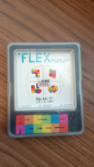 Juego de lógica Flex Puzzler para mayores de 7 años. Incluye 80 desafíos multinivel. - Contiene piezas de colores para construir figuras. - Fomenta el pensamiento espacial y la resolución de problemas.