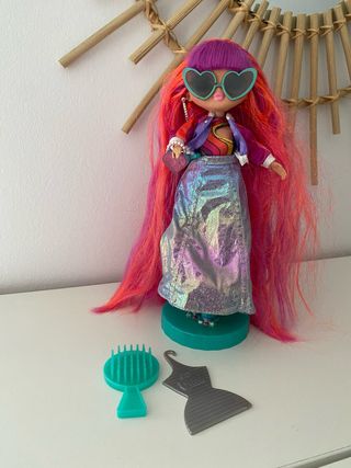 Muñeca LOL Surprise original de segunda mano en buen estado. Cabello largo rosa y naranja, gafas en forma de corazón y falda holográfica. Incluye accesorios visibles en las imágenes: bolso, zapatos, peine y base. Con señales normales de uso. Se vende tal como se muestra en las fotos.