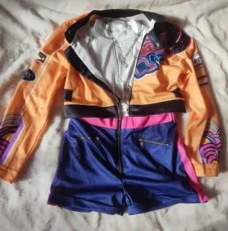 Conjunto de disfraz inspirado en K-pop, talla 9-10 (140cm) - Chaqueta naranja con detalles gráficos y cremallera. -Camiseta blanca y colgantes - Pantalón corto azul con cremalleras. - Incluye trenza de pelo morada. Nuevo sin estrenar