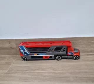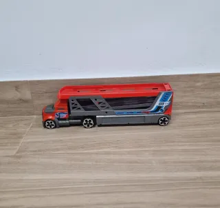 Camión transportador de coches Hot Wheels en color rojo y gris. Puede transportar hasta 14 coches. En el lateral incluye botón para sacar los coches por la parte delantera del camión