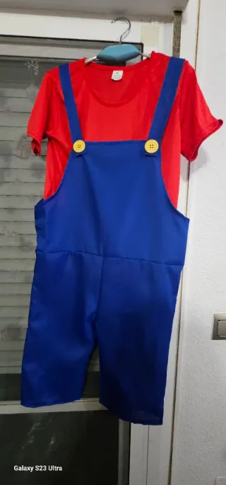 Disfraz inspirado en Mario Bros, ideal para fiestas o eventos. - Camiseta roja de manga corta. - Peto azul con tirantes. - Dos botones amarillos decorativos en los tirantes.