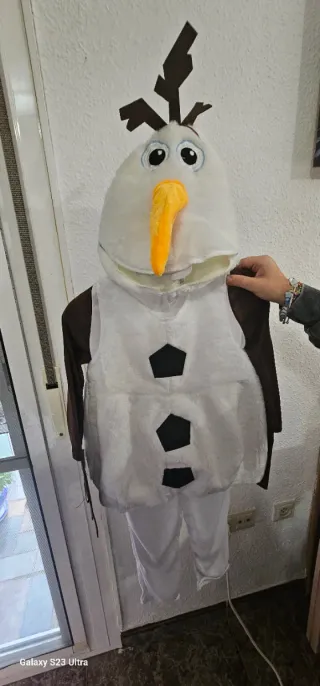 Disfraz del personaje Olaf de Frozen, ideal para niños. - Incluye capucha con cara y zanahoria. - Cuerpo blanco con botones negros. - Mangas y pantalón marrones y blancos.