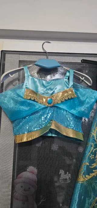Conjunto de disfraz inspirado en la Princesa Jasmine, talla XS. Perfecto para fiestas o disfraces. - Conjunto de dos piezas: top y pantalón. - Color azul turquesa con detalles dorados. - Adornado con lentejuelas y monedas. - Tejido satinado y translúcido.
