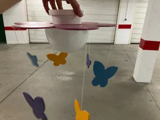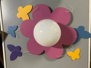 Lámpara infantil con un diseño alegre de flor y mariposas colgantes - Flor central en color fucsia. - Mariposas decorativas en colores azul, morado y amarillo. Como nueva. Ideal para dormitorio o cuarto de juegos.
