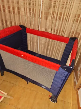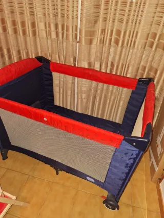 Práctica cuna de viaje o parque infantil, fácil de montar y desmontar. - Estructura resistente. - Laterales de malla transpirable. - Bordes acolchados en color rojo. - Ruedas para facilitar el desplazamiento. Incluye colchon y bolsa de trasporte. Medidas 1,15 cm de largo x 80 cm ancho x 80 cm de alto.