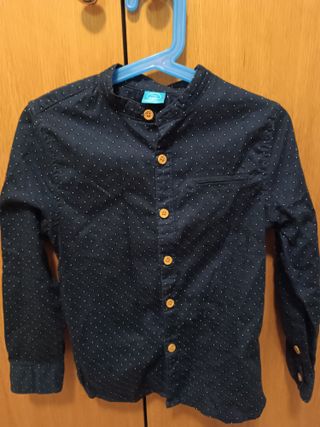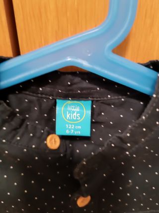 Camisa de manga larga para niño con un divertido estampado de lunares blancos sobre fondo azul marino. Perfecta para el día a día. - Marca: Little Kids - Talla: 122 cm (6-7 años) - Cierre de botones de madera en la parte delantera. - Cuello mao. - Botón en el codo para recoger manga
