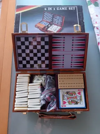 Maletín de juegos versátil que incluye varios tableros y accesorios para diferentes juegos. - Tablero de ajedrez y damas. - Tablero de backgammon. - Piezas de juego. - Cartas. - Cribbage board. - Dominó. Caja con signos de uso, maletín en perfecto estado.