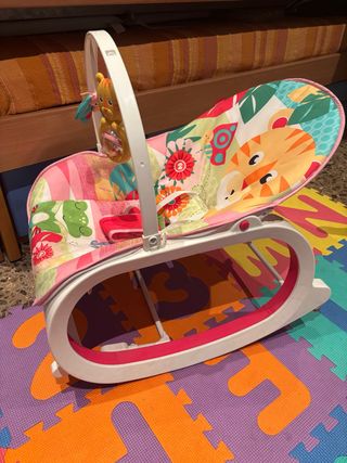 PRECIO NEGOCIABLE Hamaca para bebés de la marca Fisher-Price con un diseño alegre y colorido. Venta por falta de uso. - Apta desde bebés recién nacidos hasta niños pequeños, soportando 18 kg. - Estructura blanca y rosa. - Tejido con estampado de animales y flores. - Incluye arco de juegos con sonajero y peluches de tucán y una pelota de león. - Cuenta con un asiento reclinable con con vibraciones relajantes. - Las patas desplegables permiten convertirla en una hamaca fija. - El acolchado del asiento es lavable en lavadora.