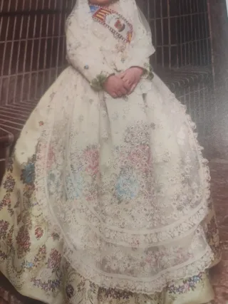 Vestido de fallera para niña de 9 años. Un traje tradicional con un diseño floral muy bonito. - Tejido principal en color amarillo claro - Delicado encaje superpuesto. - Adornos florales en tonos pastel. -Confeccion Alvaro Moliner -Manteletas preciosas