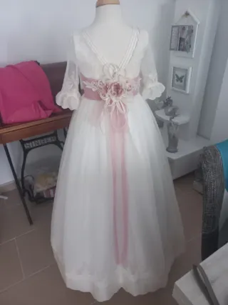 Vestido de comunión para niña, elegante y delicado. Del diseñador valenciano Anibal Laguna. Incluye tocado y zapatos. - Color blanco. - Mangas largas con volantes. - Cinturón rosa con flores decorativas. - Falda larga de tul. - Detalle de encaje en el bajo.
