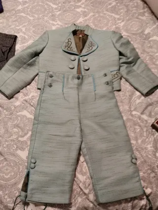 Traje regional de fallero en color azul claro, con detalles bordados en el cuello y mangas. - Chaqueta con cuello mao y doble abotonadura. - Pantalón corto hasta la rodilla con aberturas laterales. - Tejido con textura y detalles en azul turquesa.