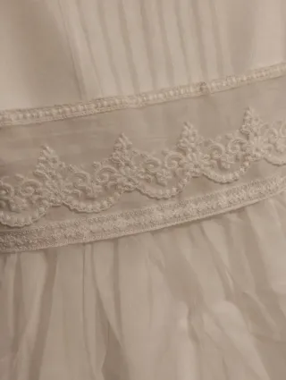 Vestido para comunión de niña, con detalles de encaje en las mangas y un lazo en la cintura. Usado 2 días, pero falta tintorería. - Tejido ligero y vaporoso. - Cierre de botones en la espalda. - Adorno de encaje en puños. - Lazada ancha en la cintura.