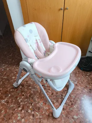 Trona de bebé con un diseño moderno y funcional, ideal para las comidas. - Asiento acolchado con estampado de lunares. - Bandeja extraíble. - Cinturón de seguridad de 5 puntos. - Estructura plegable para fácil almacenamiento.