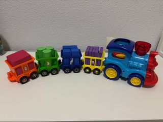 Tren de juguete articulado para niños, con vagones que se conectan entre sí. Ideal para el desarrollo de habilidades motoras y reconocimiento de números. - Vagones de diferentes colores: naranja, verde, azul y amarillo. - Piezas de construcción apilables en los vagones. - Números del 2 al 5 visibles en los vagones.