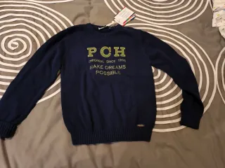 Suéter de punto azul marino de la marca Pan y Chocolate. Presenta un diseño con letras PCH bordadas en color verde. - PCH bordado en verde. - Cuello redondo y manga larga. - Puños y bajo de canalé.