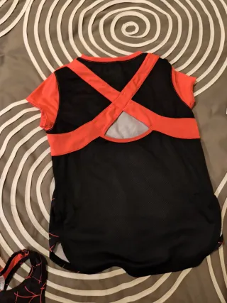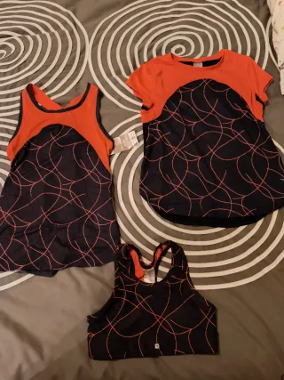 Conjunto de tres prendas deportivas para niña, ideal para actividades físicas. - una camiseta sin mangas de color negro con estampado de líneas fucsia. con etiquetaTalla 8-9 - Una camiseta de manga corta de color fucsia con la parte inferior estampada. Talla 8-9 -:Top a juego con las camisetas Talla 7-8 - Diseño moderno y cómodo. Si se vende por separado 4 eur cada prenda.