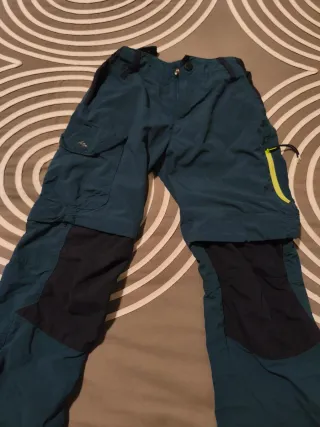 Pantalón de montaña de color verde oscuro, ideal para actividades al aire libre. Marca Quechua Talla 7-8. - Diseño convertible, se puede usar como pantalón largo o corto. - Tejido resistente y cómodo. - Bolsillos cargo laterales. - Detalle de cremallera en los laterales. - Cintura con trabillas para cinturón. y cinturilla auto ajustable con botón por dentro