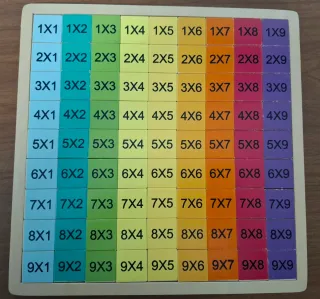 Juego didáctico de madera para aprender las tablas de multiplicar. - Tablero con casillas de colores. - Solución ubicada en la parte posterior - Incluye multiplicaciones del 1x1 al 9x9.