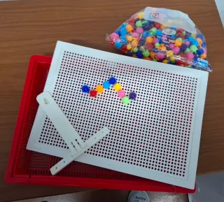 Juego de mesa para niños con clavijas de colores. - Tablero blanco con múltiples agujeros. - Incluye clavijas de plástico de varios colores: rojo, azul, naranja, amarillo, verde y morado. - Bolsa de clavijas adicional. - Soporte blanco para el tablero.