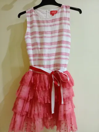 Vestido de fiesta para niña de Adolfo Domínguez. Ideal para ocasiones especiales. - Diseño de rayas finas en blanco y rojo en la parte superior. - Falda con volantes en tul rojo, con pequeños corazones. - Cinturón de lazo en blanco y rojo.