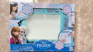 Juego de mesa Light and Trace de Disney Frozen para dibujar y colorear. - Incluye proyector para trazar dibujos. - Personajes de la película Frozen. - Fomenta la creatividad. - Apto para niños a partir de 4 años. Proyector de Frozen con luz para hacer dibujos. Tiene un cajón para poner los dibujos y las pinturas. Funciona con 3 pilas AA. En caja original. En buen estado.