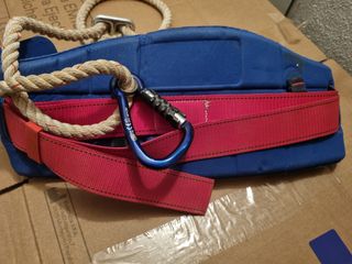 Arnés de seguridad completo con cuerda y mosquetones. - Arnés azul con detalles en rojo. - Cuerda de seguridad. - Mosquetones metálicos.